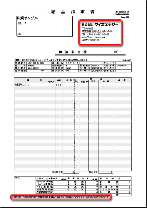 マスタ登録した会社情報(赤枠)が印刷されます。
