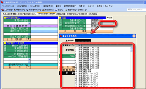 重量税の項目をダブルクリックして重量税参照画面を開いて、重量税リストボックス(赤枠)をクリックしたところ。