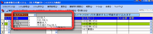 仕入入力画面の仕入パターンリストボックス(上図赤枠)から仕入パターンを選択する例。